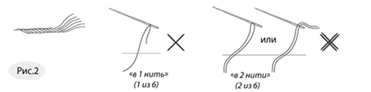 Пасма мулине состоит из 6 нитей. Чтобы готовая работа не отличалась от фото на обложке набора и во избежание недостачи мулине, используйте строго указанное в схеме набора количество нитей. На Рис.2 показано, что обозначает «вышивка в 1 нить» и «вышивка в 2 нити».