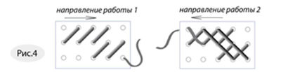 Вышивку лучше вести горизонтальными рядами. Сначала накладывайте нижние стежки, двигаясь в одном направлении, затем, возвращаясь, верхние (Рис.4). Чтобы вышивка была аккуратной, соблюдайте одинаковый порядок наложения верхних и нижних стежков. Натяжение нити должно быть одинаковым, в меру свободным, чтобы крестик получался объемным.