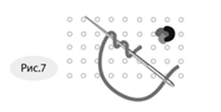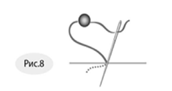 Выведите иглу с изнаночной на лицевую сторону канвы. Обвейте нить вокруг острия иголки (один раз — для узелка с одинарной навивкой, два раза — для узелка с двойной навивкой). Натягивая нитку, выведите острие иглы на изнаночную сторону, отступив от выходящей нитки 1 -2 мм. Аккуратно проведите иглу на изнаночную сторону, одновременно прижимая узелок большим пальцем. Затяните узелок (Рис.7).